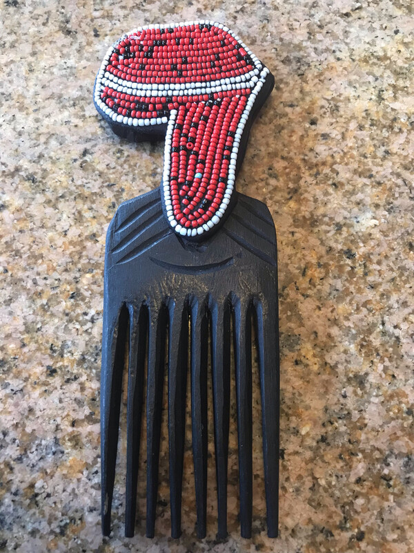 Red/Gold/Green Beaded Africa Ebony Carved Pick